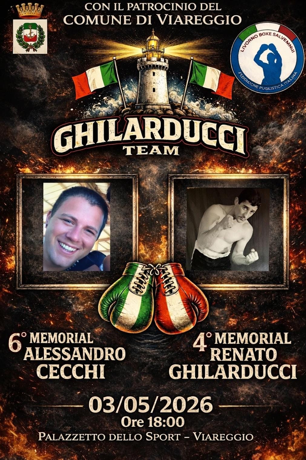 Domenica 3 maggio alle ore 18.00 il Palazzetto dello Sport di Viareggio ospiterà il 6° Memorial Alessandro Cecchi e 4° Memorial Renato Ghilarducci organizzato dal Ghilarducci Team (Boxe Salvemini Livorno) con la co-organizzazione del Comune di Viareggio.
